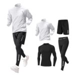 コンプレッションウェア メンズ 長袖 4点セット。吸汗速乾で通気性抜群のスポーツウェア。トレーニング、ウォーキング、サイクリングに最適。シンプルなデザイン、Mサイズ、ホワイトセット。