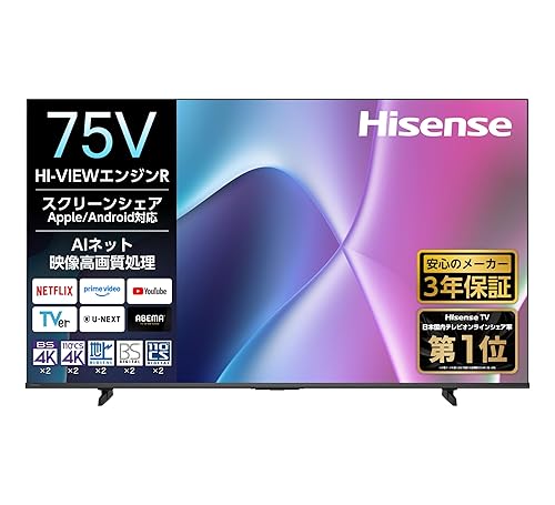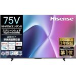 ハイセンス 75V型 75E50Rは4Kスマートテレビで、Wチューナー、HDMI2.1、低遅延ゲームモード、Alexa、AirPlay2に対応。3年保証付きの2025年モデル。