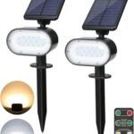 Soramee ソーラーライト2個セットは、電球色と昼白色を切り替え可能な屋外用スポットライトです。明暗センサー搭載で自動点灯・消灯、IP65防水のため耐久性もあり、リモコン付きで便利です。
