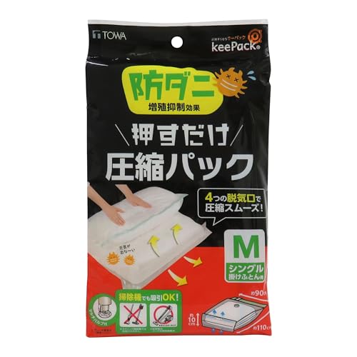 東和産業BKの防ダニ押すだけふとん圧縮袋Mサイズ(90×110cm)は、押すだけで簡単に圧縮でき、ダニやほこりを防ぎます。収納スペースを有効活用できる便利なアイテムです。