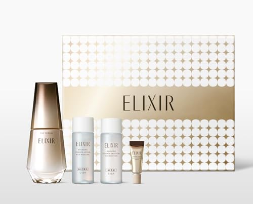 ELIXIRエリクシールの限定ギフトキットは、ザ セラム50mL、リンクル小型2g、化粧水・乳液各18mLがセット。美肌成分トラネキサム酸配合でハリとうるおいを与え、エイジングケアに最適です。ギフトボックス付き医薬部外品。