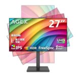 AGEX 4Kモニター27インチ。Fast IPS搭載、高さ調整機能、縦横回転可能。LGパネル、UHD(3840×2160)、HDR10対応。AMD FreeSync、HDMI/DP接続、明るさ400cd/m²。PC/Mac/PS5対応で、デザインや事務作業に最適。