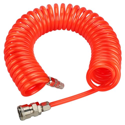 エアーホース6m、内径6.5mm×外径10mm。スパイラルバネ式でオス/メス快速ジョイント付。高耐圧・高耐久、空気圧ツールや機械潤滑剤の輸送に最適。
