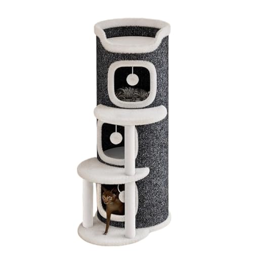 Muadressキャットタワーは、三段式の円筒形デザインで、ジャンプ台や爪とぎ付き。省スペースで組み立て簡単、屋内用のコンパクトな猫ハウスです。