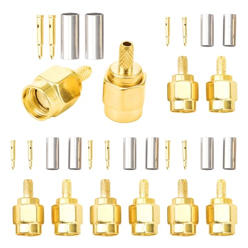 SMAオスコネクタの10個セット。内ネジ・内針の圧着タイプで、RG316、RG174、RG188などの同軸ケーブルに対応。合金製で通信機器に最適です。