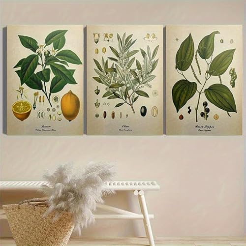 ヴィンテージスタイルのレモン、オリーブ、ペッパーツリーのイラストを使用したキャンバスウォールアートです。寝室やリビングルームにぴったりのポスタータイプで、額無しでの提供。おしゃれな空間演出に最適。