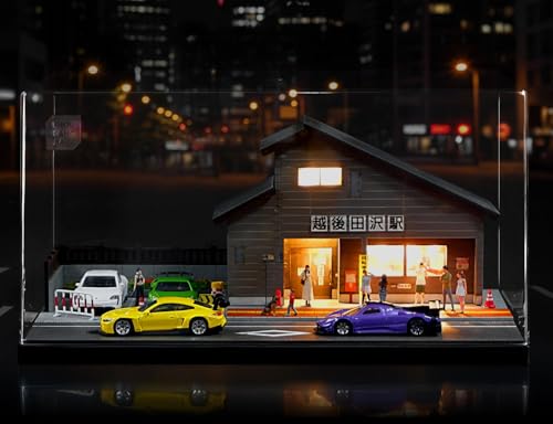 Raineedの日式ジオラマ、1/64スケールのラーメン屋と駅屋セット。LEDライト、USB接続、ミニチュア人形付き。アクリル製で防塵、ディスプレイやコレクションに最適。男性へのプレゼントや撮影背景に最適。
