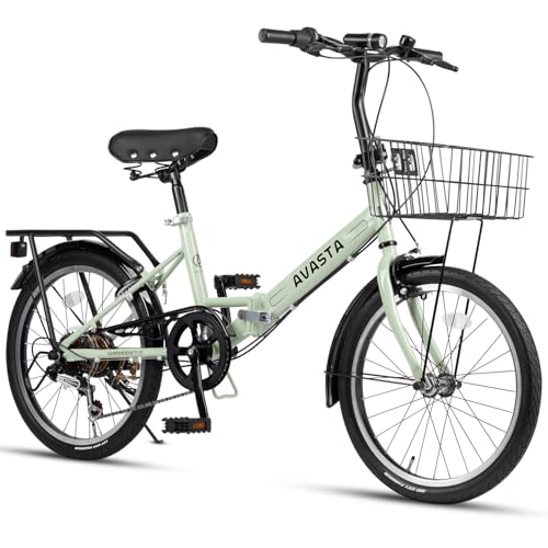 AVASTAの20インチ折りたたみ自転車は、コンパクトに収納でき、中学生から大学生まで対応。シマノ7段変速搭載で通勤通学や短距離移動に最適。前カゴ、後ろ荷台付きで夜間ライトとロッカー付きも魅力。ライトグリーン色。