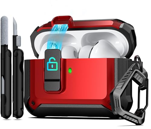 RFUNGUANGOのAirPods Pro第3世代用保護ケース。安全ロッククリップと自動ポップアップ機能付き。フル耐衝撃設計で、レッドカラーが特徴。