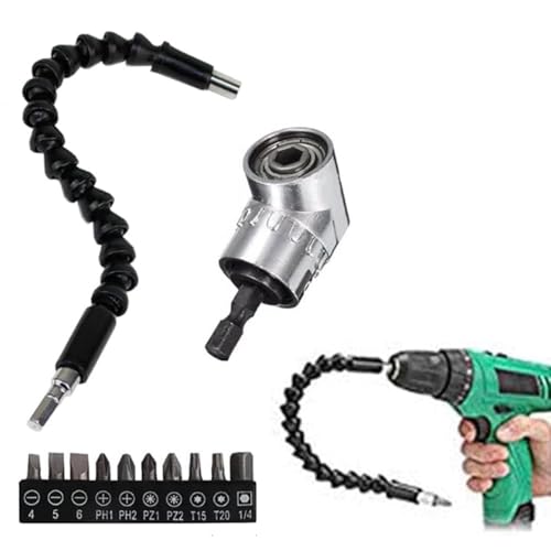 フレキシブルシャフト接続工具セットは、105度直角ドリルと六角ドライバービット付き。電動ドリル用のアクセサリーで、ネジ締めや穴あけ、ソケットアダプターも対応。DIYや家具修理、PCケース、電気キャビネット作業に最適です。
