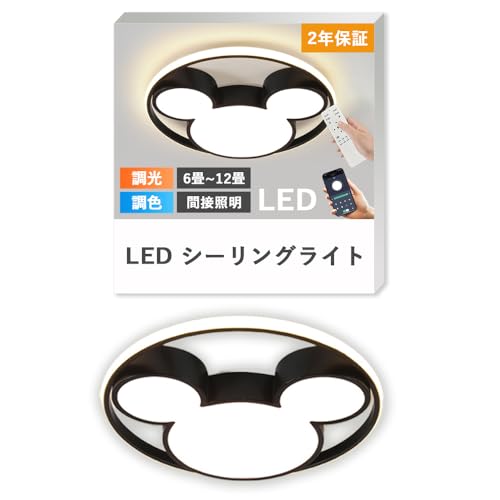 シーリングライトは、子供部屋や寝室に最適な可愛い北欧デザイン。リモコン操作やスマホ対応で調光・調色可能。対応畳数は6〜12畳、簡単取付。サイズは52cm(ブラック)。