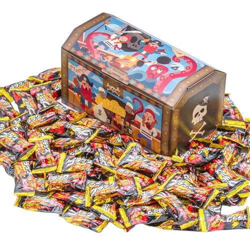 ブラックサンダーの詰め合わせ、パイレーツデザインの宝箱に入ったミニバー900g。多彩なお菓子とチョコレートが楽しめるギフトセットです。