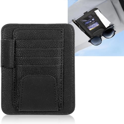 車用サンバイザーポケットは、車内の小物を整理するための多機能収納ホルダーです。眼鏡やカード、名刺を収納可能で、滑り止め付きのブラックデザインが特徴です。駐車券などの収納にも便利です。