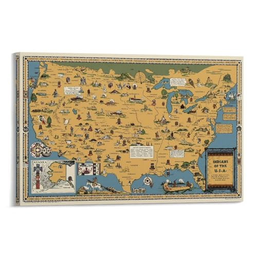 アメリカインディアン部族地図ポスター。部屋飾りやホームアートに最適なキャンバスウォールアート。サイズは16×24インチ(40x60cm)。壁掛けにぴったりのデザインで、文化を感じる空間を演出します。