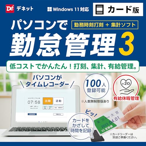 勤怠管理3 カード版は、カードリーダーで簡単チェックイン・アウトを実現。従業員の勤務時間を正確に把握できます。直感的なインターフェースで使いやすく、導入も簡単です。