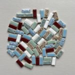 作善堂のモザイクタイルは、昭和レトロ風のデザインで、サイズは25×11×4mm。7色アソートで約70個、合計200gの美濃焼製品。DIYやクラフトに最適です。