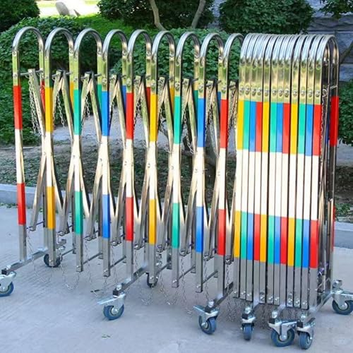 Uhetoiceの屋外用ステンレス製伸縮フェンスは、5mの長さでキャスター付き。ペット用や工事現場の遮断、アウトドアでの使用に最適なポータブルバリケードです。