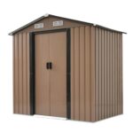屋外用スチール収納庫、サイズ幅184cm×奥行132cm×高さ196cm。防水ドア付きの引戸設計で、ガーデニングや庭の整理に最適。ロック機能あり、おしゃれなブラウン仕上げ。