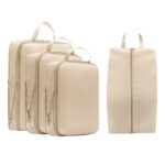 2025年版圧縮バッグ、旅行用4点セット。ポケット圧縮袋で衣類を整理、可変スペース設計で空間を節約。出張や旅行に便利なベージュの包装袋。