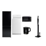[山善] 新生活家電5点セットには、冷蔵庫157L、洗濯機6kg、電子レンジ17L、ケトル、クリーナーが含まれています。ブラックカラーで、一人暮らしに最適な製品です。