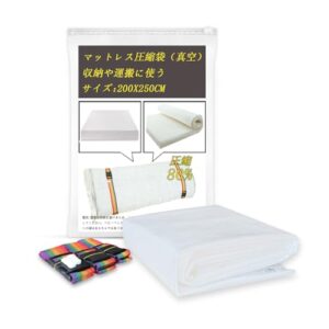 マットレス圧縮袋と布団圧縮袋の2枚セットです。特大サイズ(240cm×130cm)で、空気漏れ防止機能あり。再利用可能で、掃除機対応。収納スペースを効率的に活用できます。