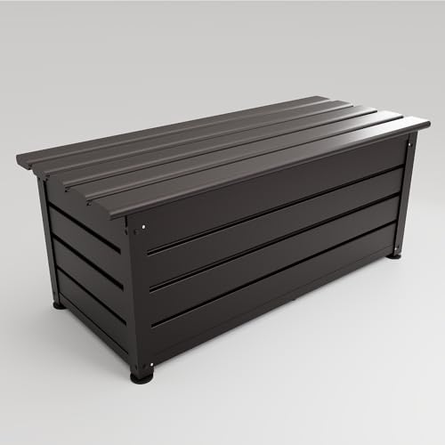 屋外用収納ベンチは、アルミ・カラー鋼製で長さ60/90/120/150cmの選択肢あり。鍵付きで安心の大容量162L、耐荷重150kg、ダンパー付きで開閉もスムーズ。キャンプ用品や灯油ポリタンクの収納に最適です。