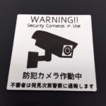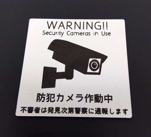 アクリル製の防犯プレート。サイズは5cm×5cmで、宅配や不審者に対する注意メッセージが記載されています。シルバーのステンレス仕上げで、マンションや事務所の入口に最適です。