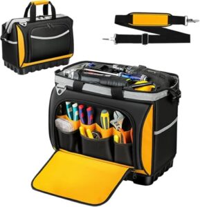 Aeroorのツールバッグは、耐摩耗性のオックスフォード生地製で、大容量の収納力を持つ。肩掛けベルト付きで持ち運び便利。多機能な作業用に適し、整備士や電気技師、大工道具など幅広く利用可能。サイズは14インチ(33*20*25CM)。