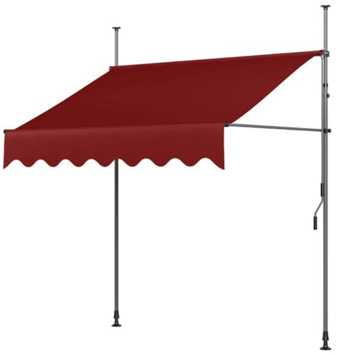 穴あけ不要の手回し式オーニング。巻き取り式で高さ調節可能、角度調整もできるサンシェード。UVカット・撥水加工済みで、日除けや雨よけに最適(350cm*120cm,レッド)。