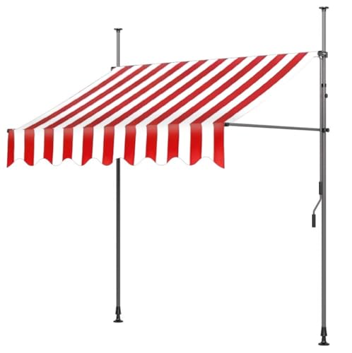 穴あけ不要の手回し式オーニング。高さ調整、タープ角度調整可能。紫外線カット、撥水加工で日除け・雨よけに最適。サイズ250cm*120cm、薄赤。