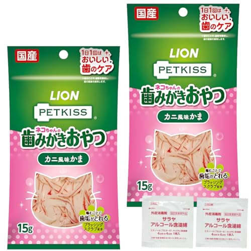 ライオンのPETKISS猫用おやつは、カニ風味のかまが15グラム入りの2個セット。オーラルケアに効果的で、猫が喜ぶ美味しさ。まとめ買いでおまけ付き!