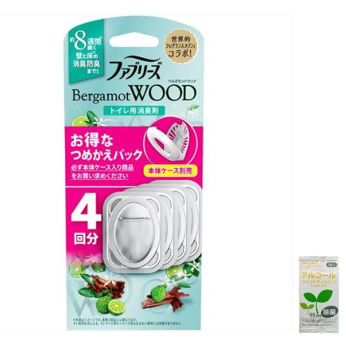 消臭剤と除菌ウェットティッシュのセットです。ファブリーズのトイレ用消臭剤はベルガモットウッドの香りで、詰替4個パック付き。手軽に使える除菌ウェットティッシュは家庭やオフィスでの衛生管理に最適です。