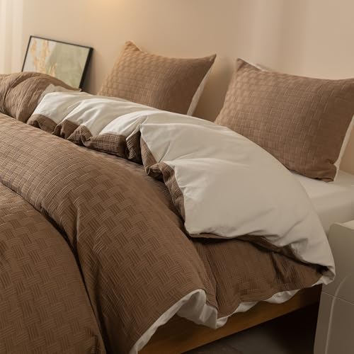 NOLAYAの布団カバー3点セットは、シングルサイズで掛け布団カバー、ボックスシーツ、枕カバーが含まれます。肌に優しいワッフル生地で、速乾性もあり、洋式・和式兼用。おしゃれな北欧デザインのブラウンカラーです。