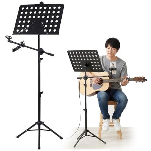 seathestarsのマイクスタンドは、多機能譜面台として使用でき、高さ75cm~145cm、角度調節が可能です。スマホ撮影や楽譜立てに対応し、滑り止めや譜面押さえ付きで便利です。