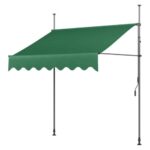 オーニングシェードは巻き取り式で高さ調節可能。前幕付きで撥水加工、簡単設置。庭園やカフェに最適、屋外使用におすすめです。インクグリーン、サイズは400cm×120cm。