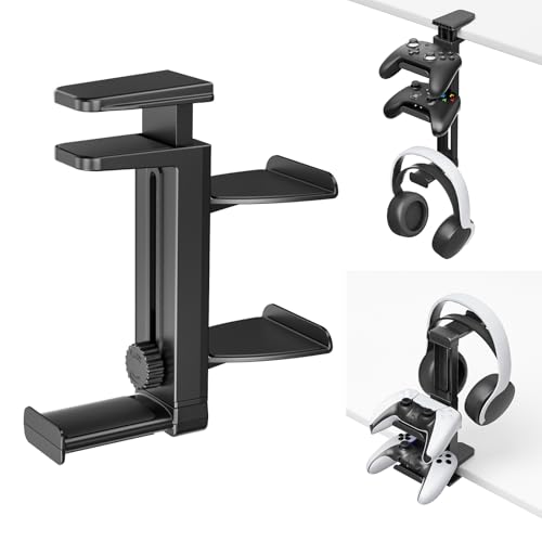 デスク下コントローラーホルダーは、調節可能なクランプで取り付け簡単。360度回転フックとケーブルオーガナイザー付き。3イン1のゲームアクセサリーをスマートに整理できます。