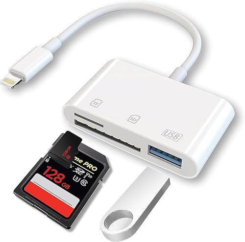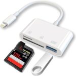 iPhone SDカードリーダー USBアダプタ 3in1。正規MFi認証品で、写真や動画ファイルの双方向高速データ転送が可能。設定不要でiPhone/iPad/カメラ/カーレコーダーに対応。