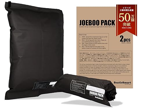 BeatleSmart JOEBOO PACKは、70cm x 50cmのサイズで2枚組。丈夫なオックスフォード生地とポリエチレンを使用し、キャンプや旅行に最適。テントやタープ、寝袋、ダウンの収納に便利なロールアップ式。