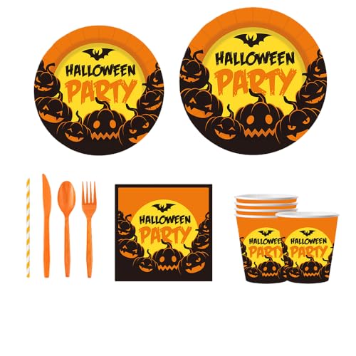 【2025年ハロウィングッズ】ハロウィンウェディングパーティーカトラリーセット、使い捨てプレート、紙皿、ナプキン、紙コップ、スプーン、フォーク、ピペット、10人、80個セット(黄色いカボチャ)
