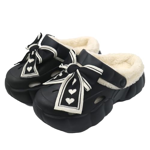 レディース冬用クロックサンダル、EVA素材、ラブリボン装飾、厚いフェイク毛皮インソール付き。かわいいデザインで、屋内外兼用の履き心地良いファッションサンダル。サイズはブラックで23.0-23.5cm。