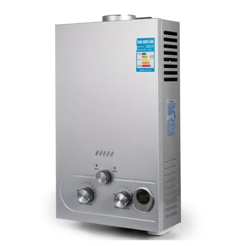 Vifxucyタンクレスプロパン給湯器は、8Lの容量を持ち、浄水器・ガス調整器が付属。デジタル表示で使いやすく、シルバーのデザインが魅力的です。