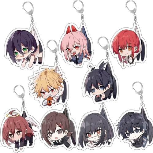 チェンソーマンのキャラクターがデザインされたキーホルダー1/9点セット。レゼ、マキマ、早川アキ、パワー、デンジ、三鷹アサ、姫野などが含まれ、バッグや鍵に簡単に取り付け可能な非公式アイテムです。通学や通勤に最適。
