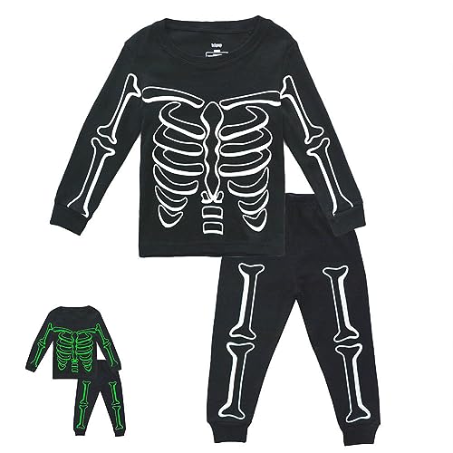 子供服光るパジャマ、男の子長袖、キッズ用ハロウィン仮装に最適。Tシャツ+長ズボンの上下2点セット。人気の骨柄デザインで、春秋冬に対応。サイズ140。