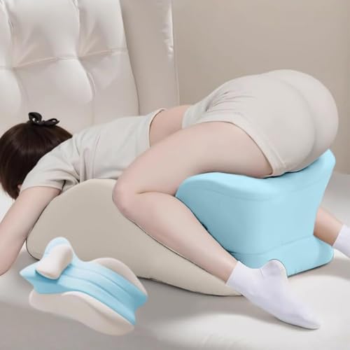 多機能うつ伏せ枕は足枕、腰枕、安眠枕などとして使用可能。高密度メモリフォーム製で、洗えるカバー付き。肩こりやゲーム、読書のサポートに最適。カラーはブルーとグレーのコンビ。