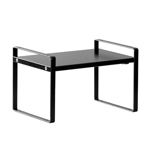 八番屋 デスクラックは、約W29.5~55×D21×H19.5cmのサイズで、伸縮可能な卓上収納ラックです。ブラック色で、積み重ねができるため、デスク上の整理整頓に最適です。