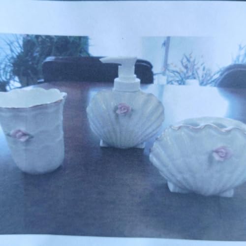 白磁の薔薇付き貝殻型バスルーム3点セットは、洗練されたデザインが特徴の未使用ショールーム展示品です。高品質な素材で作られ、バスルームを華やかに演出します。セット内容は、ソープディッシュ、トイレタリーケース、歯ブラシホルダーの3点です。