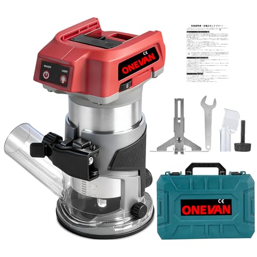 ONEVAN 電動トリマーは、マキタ18Vバッテリー互換で充電式。6段変速、1000W高出力、数値表示付き、透明ベース、深さ30mm精密調整、LEDライト、アルミボディ装備。木工加工、面取り、彫刻に最適なDIY用電動工具(本体のみ)。