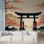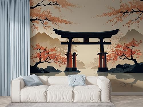 のり付きの和風壁紙で、鳥居と富士山、桜がデザインされたウォールステッカー。シール式で、はがせるタイプのDIY装飾シート。サイズは300×210cmで、壁や家具におしゃれに活用できます。