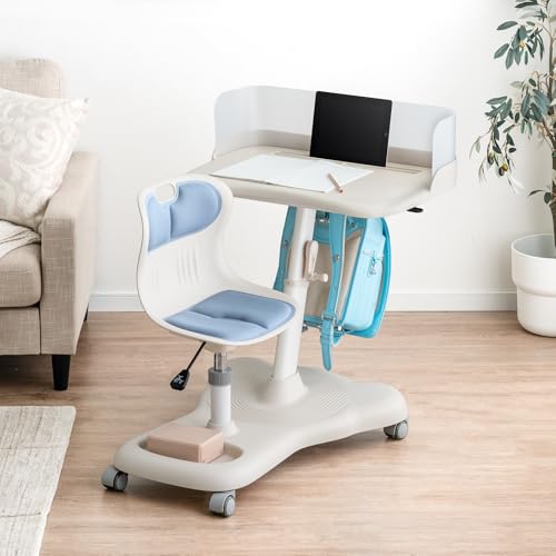 タンスのゲン キッズデスクは、一体型のデスクとチェアで、高さ調整可能。キャスター付きで移動も楽々。対象年齢は3歳から12歳で、学習に最適なデザインです。