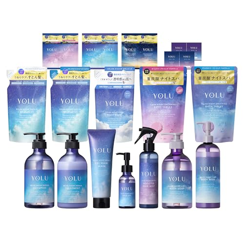 2026年YOLUの福袋には、シャンプー・トリートメントセット、アウトバス、ボディケア、バスタブレット、スキンケアなど16点が含まれ、リラックスナイトリペアをテーマにしたWEB限定商品です。